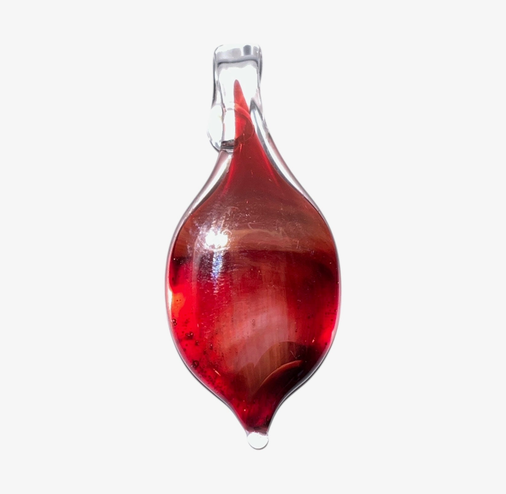 Scarletcore is a pendant of focused intensity. Its smooth, elongated form holds a glowing center of rich crimson and ember red—like a slow-burning flame or a drop of molten sap. Suspended in clear glass, the inner color seems to pulse gently, drawing the eye inward.